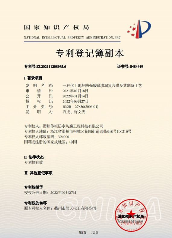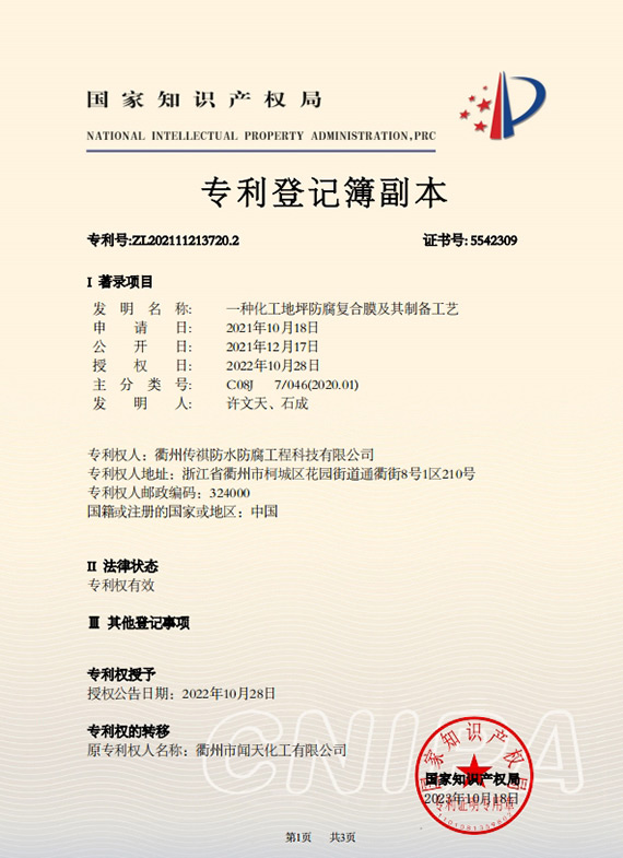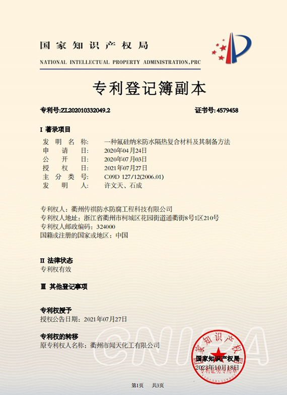 衢州傳祺新材料科技有限公司是衢州市聞天化工有限公司的下屬企業(yè);衢州市聞天化工有限公司成立于2003年,是國內最早研發(fā)、生產(chǎn)氟碳涂料的企業(yè)之一。衢州傳祺新材料科技有限公司成立于2017年,公司專注于高分子氟材料的開發(fā)和含氟材料在防腐、防水領域的應用。經(jīng)過6年的不懈努力,已獲得了化工和建筑領域六項國家發(fā)明專利授權和兩項新產(chǎn)品科技成果獎,參與了中國建筑材料流通協(xié)會《房屋修繕防水工程規(guī)范》標準的編制工作,中建協(xié)涂裝委員會浙西工作站設立在我公司。